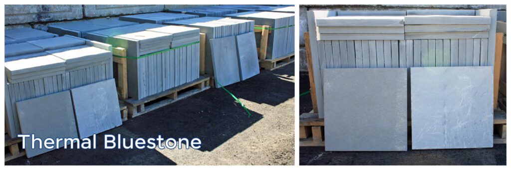 Deeper within the quarry, subject to greater weight and pressure, lies a different type of bluestone stock with fewer fault lines. Once cut from the bedrock, this bluestone must be sawn into layers. The stone is then “thermalled” – which involves rapidly heating it with a high temperature torch to create a uniformly rough texture. This surface distinguishes Thermal Bluestone from the natural cleft surface of Natural Blue Select and Natural Full Color Select bluestones, which is irregular and unique to every piece.